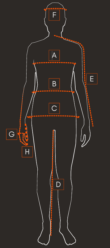 Testmagasság Mellkas körméret (A) Derékméret (B) Csípőméret (C) Láb belső hossza (D) Ujjhossz (E)